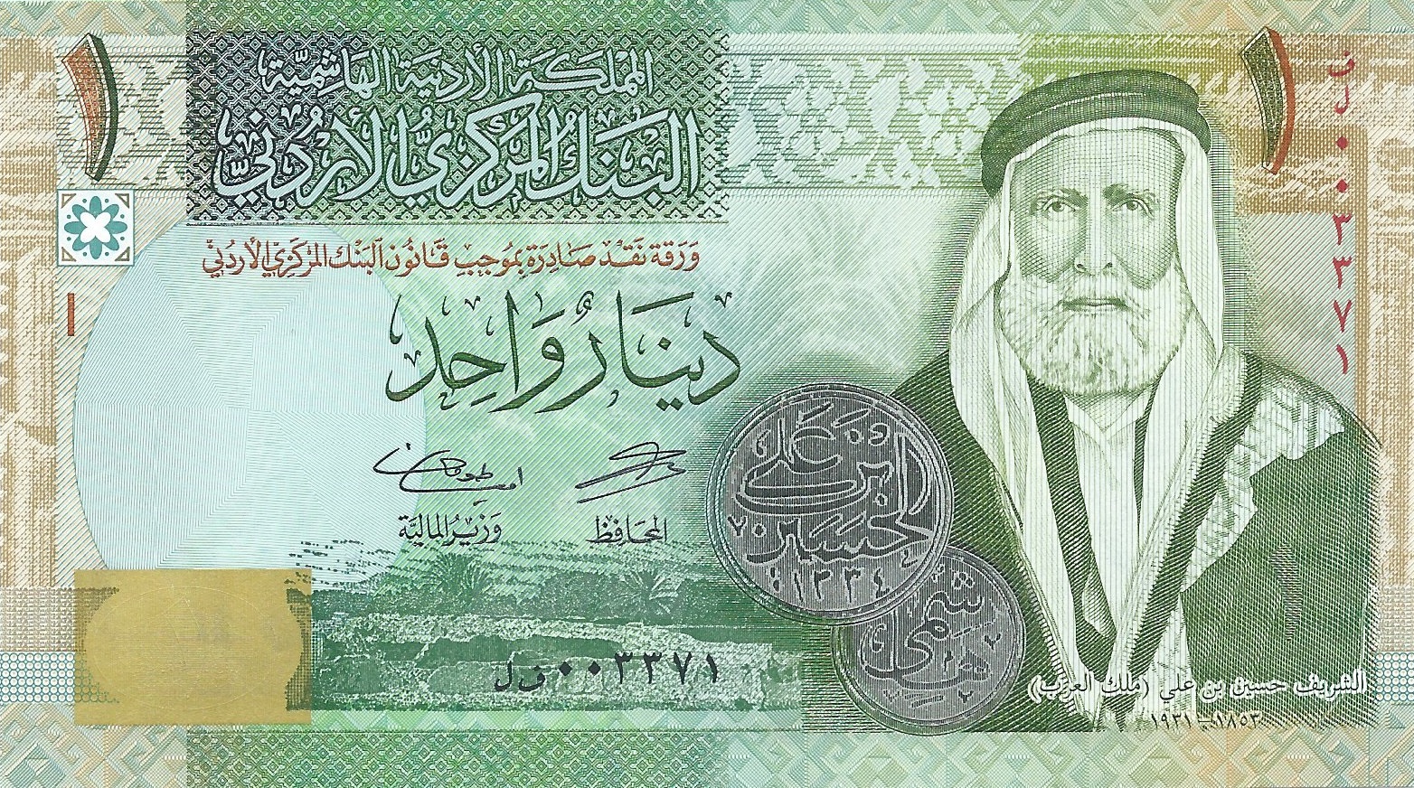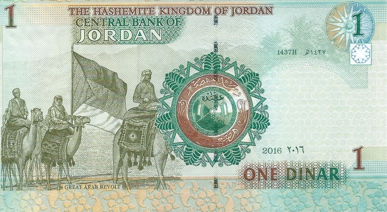 AH1437/2016. Green, gold, and brown on multicolored underprint. Sherif Hussein ibn Ali at right and as watermark. Silver coins, Great Arab Revolt scene on back. Printer: (T)DLR.