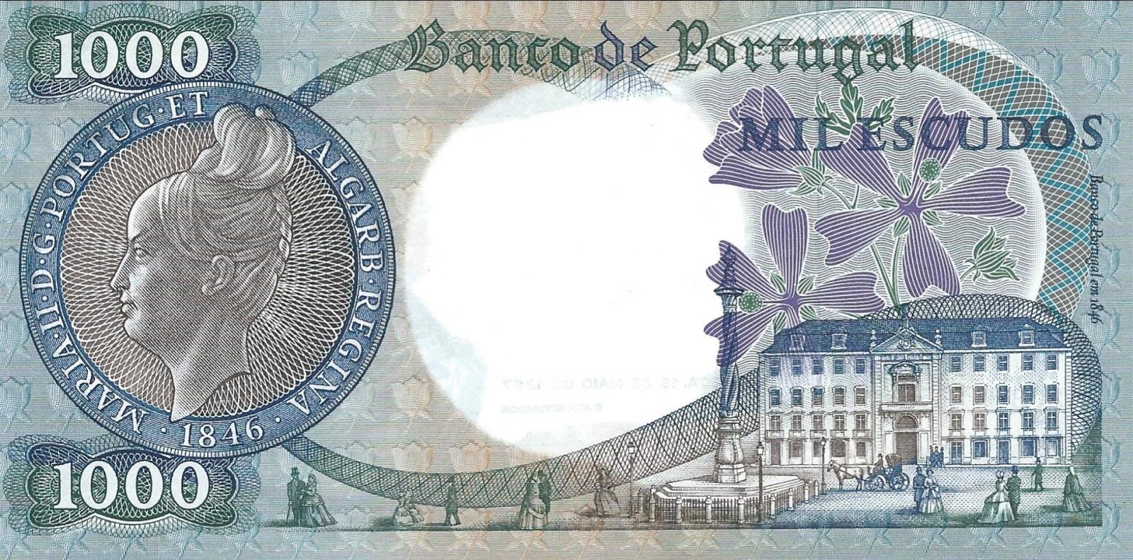 19.5.1967. Blue, dark brown and violet on multicolor underprint. Queen Maria II at right. Ch. 10. 24 signature varieties. Back: Her medallion portrait at left, Banco de Portugal in 1846 building at lower right. Watermark: Queen Maria II. Printer: JEZ (without imprint). Signature titles: O GOVERNADOR and O ADMINISTRADOR.