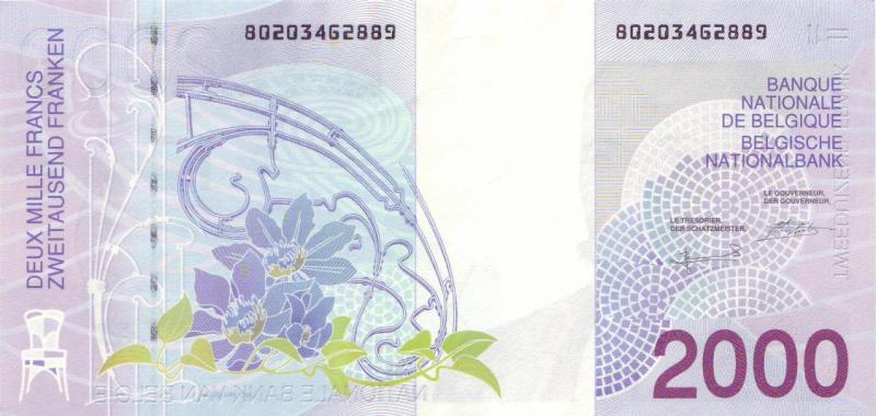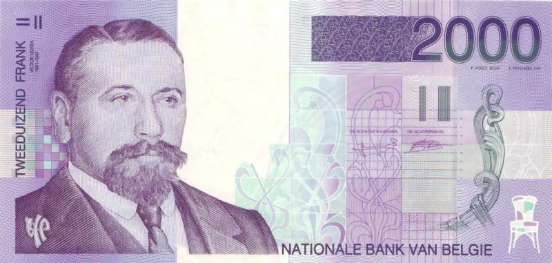ND (1994-2001). Purple and blue-green on multicolored underprint. Baron Victor Horta at left, and as watermark. Flora and Art Nouveau design at left on back.