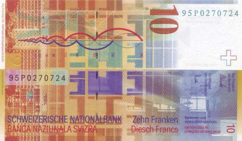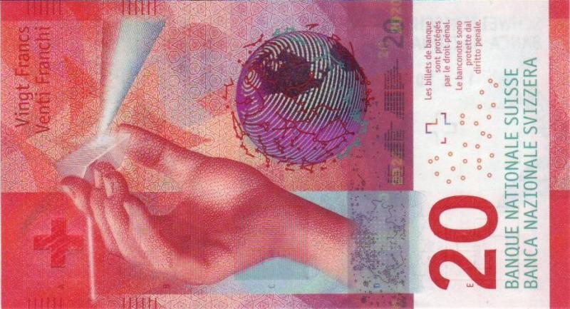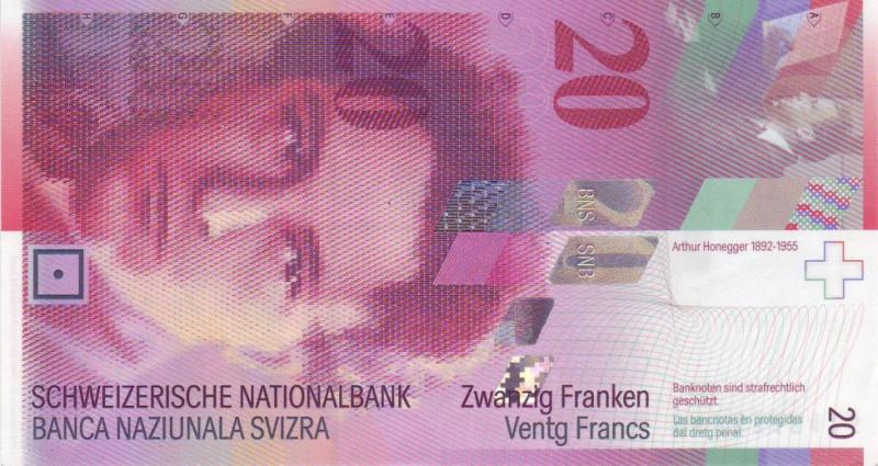 20(16). Orange and brown on yellow underprint. The design focuses on Switzerlands organisational talent, expressed by time -- the note's key motif.