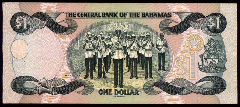 Deep green on multicolored underprint. Fish at left, Royal Bahamas Police Band at center on back. Serial number vertical and horizontal. Printer: BABN.