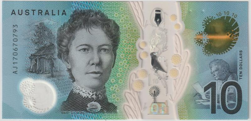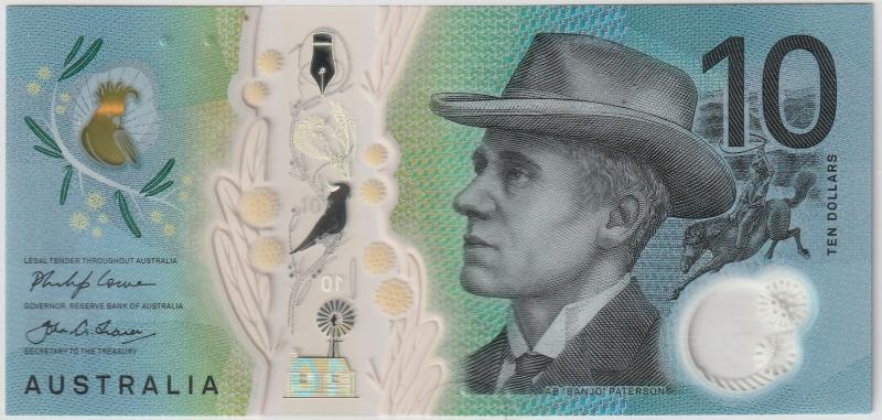 (20)17; first issued on the 20th of September, 2017. Blue, brown and multicolored. AB "Banjo' Paterson at right center and horseman at right. Bramble Wattle (Acacia victoriae) and the Sulphur-crested Cockatoo (Cacatua galerita) printed on transparency. Areas of micro text which feature excerpts from Gilmore and Paterson’s poems "No Foe Shall Gather Our Harvest" and "The Man from Snowy River". The hut on the front side of the banknote references life in the Australian bushland as described in the poetry of Dame Mary Gilmore. Back: Mary Gilmore at left center. Nib pen at top right, cockatoo and homestead in strip. The image of the horseman on the back side of the banknote is the designer's interpretation of a horseman from the era of Paterson’s writing. Printer: NPA. Polymer banknote.