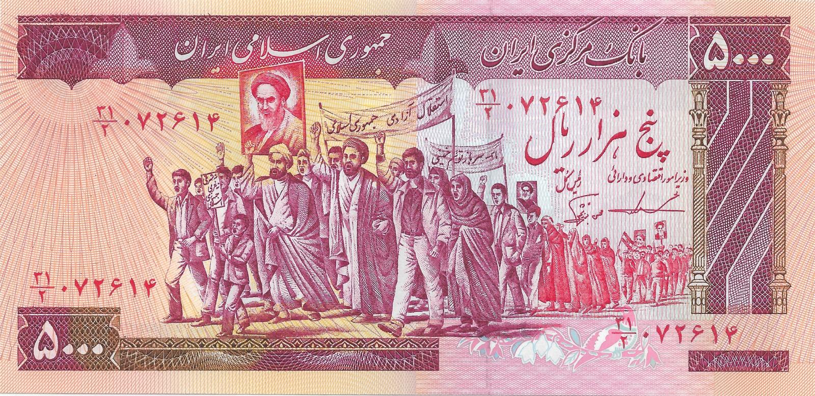ND (1983-). Violet, red-orange, and brown on multicolored underprint. Mullahs leading marchers at center. Radiant sun removed from upper left on face. Two small placards of Khomenhi added to crown. Watermark: arms.