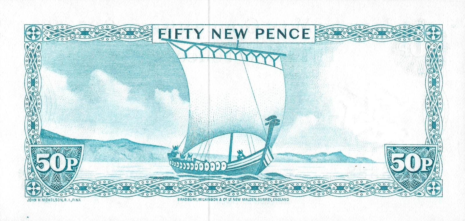 ND (1972). Blue on multicolored underprint. Triskele arms at center and as watermark, older portrait of Queen Elizabeth II at right. Signature title LIEUTENANT GOVERNOR. Printer: BWC. Old sailing boat on back. 126x62mm.