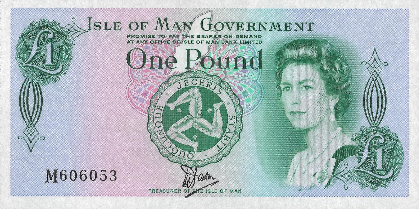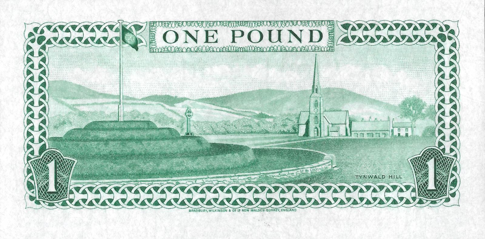 ND (1983). Green on multicolored underprint. Triskele arms at lower center and as watermark, young portrait of Queen Elizabeth II at right. Printer: BWC. Tynwald Hill on back. Printed on Bradvek.