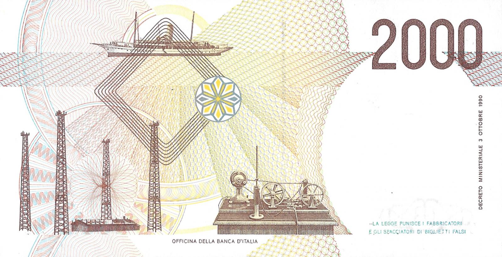 Decredo Ministeriate 3.10.1990. Dark brown on multicolored underprint. Arms at left center, G. Marconi at right and as watermark. Marconi's yacht Elettra at upper left center, radio towers at left, early radio set at center on back. Seal with winged lion.