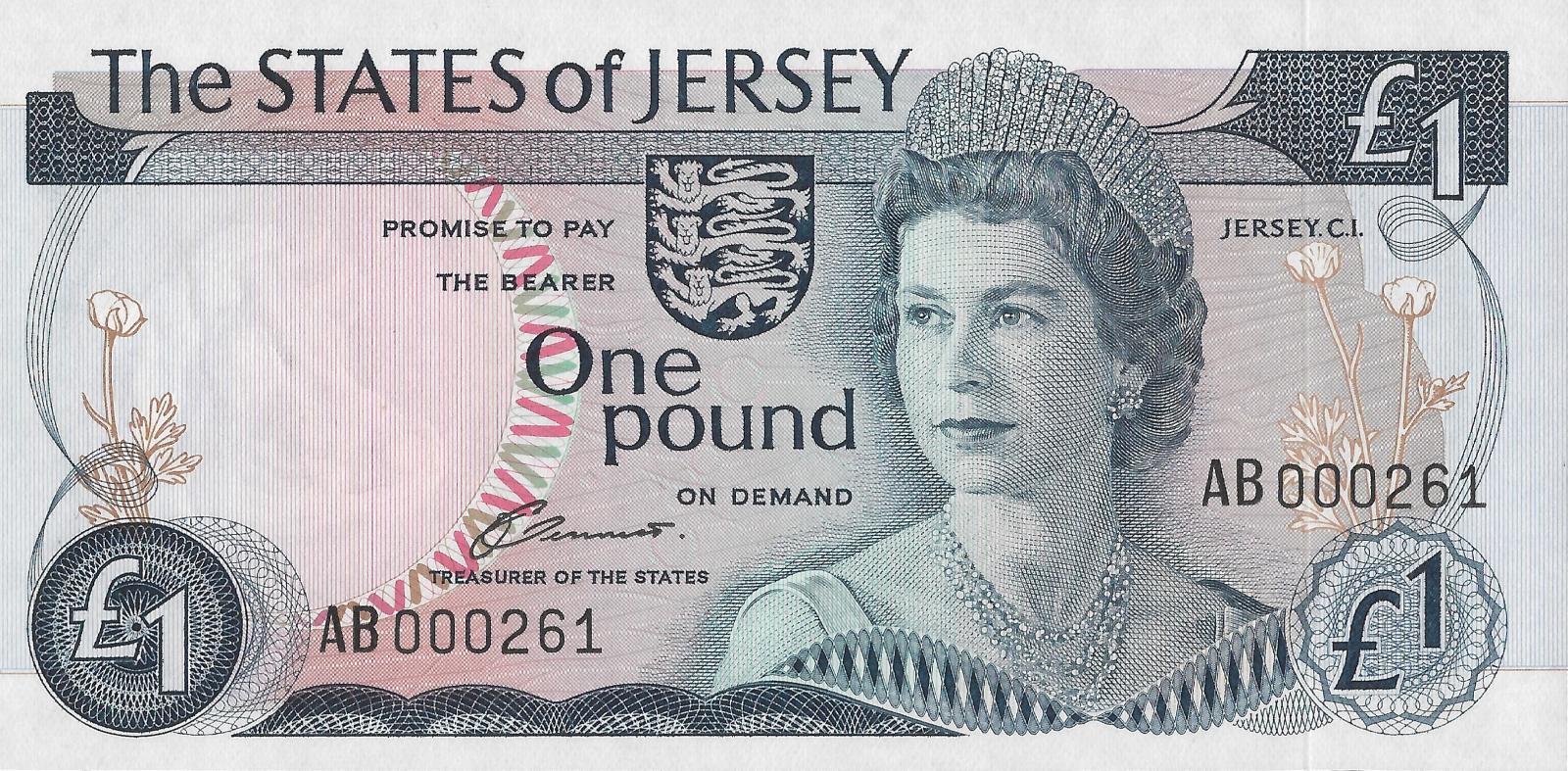ND (1976-1988). Blue on multicolored underprint. Queen Elizabeth at center right looking left wearing a tiara. Battle of Jersey scene on back. Watermark: Jersey cow's head. Printer: TDLR.