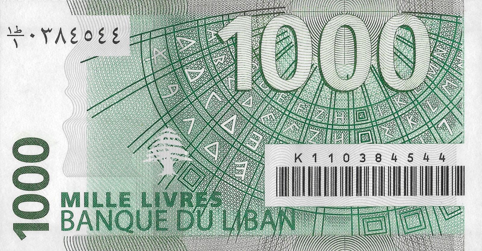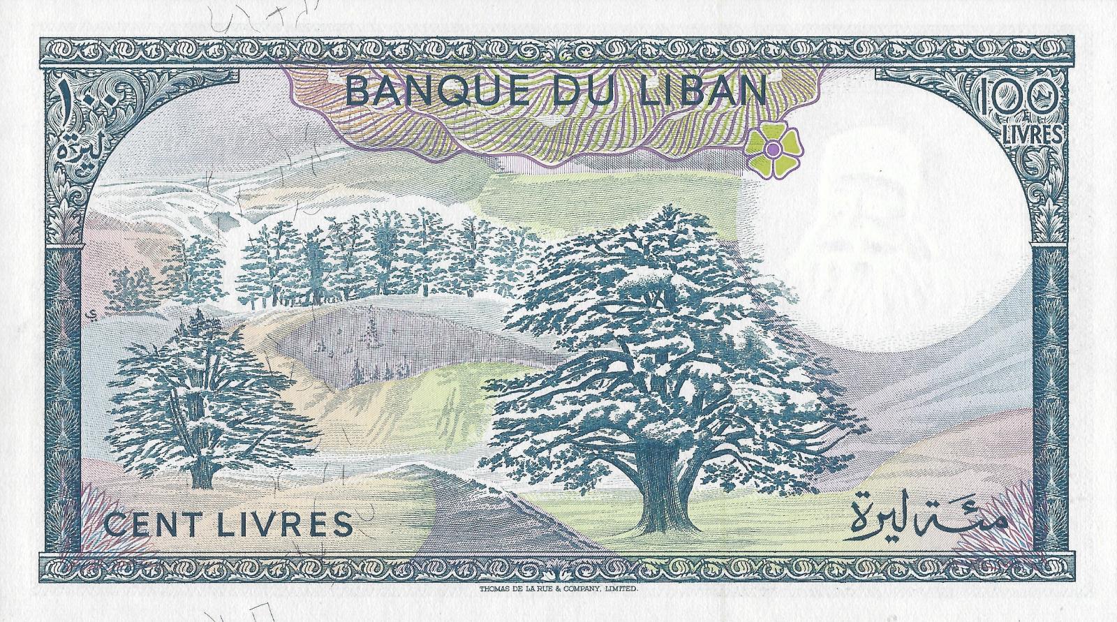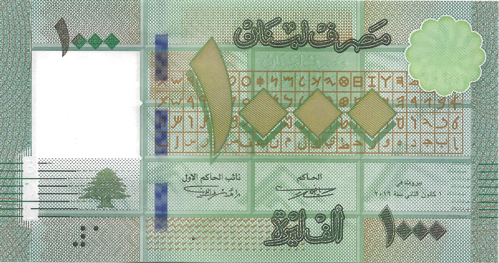 1988. Blue on light pink and light blue underprint. Palais Beit-et-Din with inner courtyard. Snowy cedars on Lebanon mountains on back. Watermark: bearded male elder. Printer: TDLR. Without a control number at upper center on face.