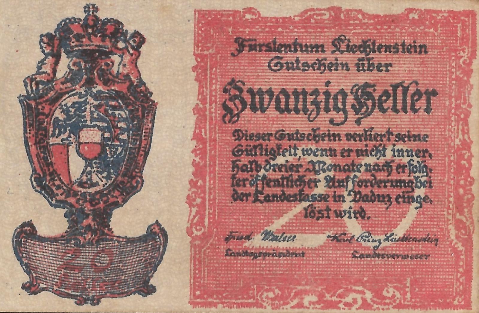Liechtenstein pick 2: 20 Heller from 1920