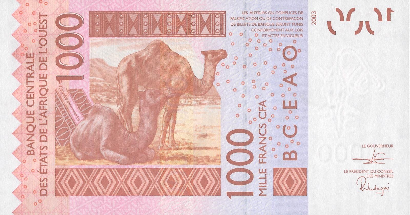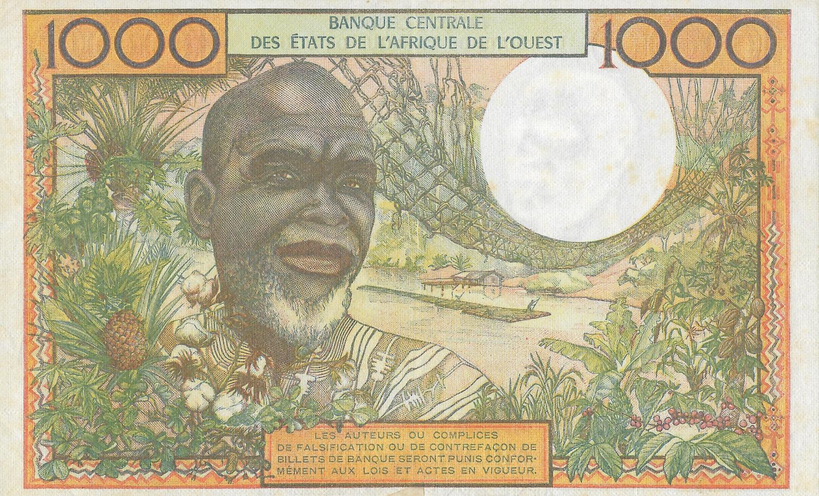 K for Senegal. 1959-1965; ND. Brown, blue and multicolor. Man and woman at center. Like p103A. Back: Man with rope suspension bridge in background and pineapples. Watermark: Man's head.