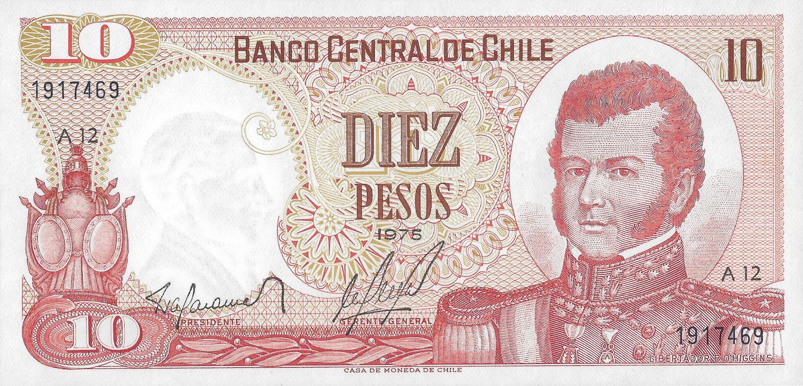 1975-1976. Red on multicolored underprint. General Bernardo O'Higgins at right and as watermark. Battle of Rancagua on back. Printer: CdM-Chile. LIBERTADOR B. O'HIGGINS under portrait.