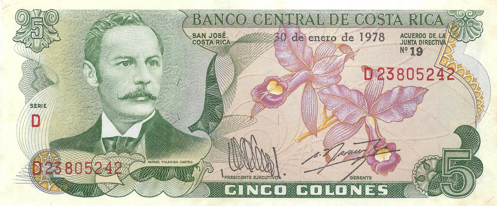 28.6.1977-4.10.1989. Deep green and lilac on multicolored underprint. Rafael Yglesias Castro at left, flowers at right. Back green on multicolored underprint; National Theater scene. Series D. Printer: TDLR. Without watermark or security thread.