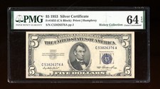 DBR $5 1953 Silver Fr. 1655 CA Block PMG 64 EPQ Serial C53826376A